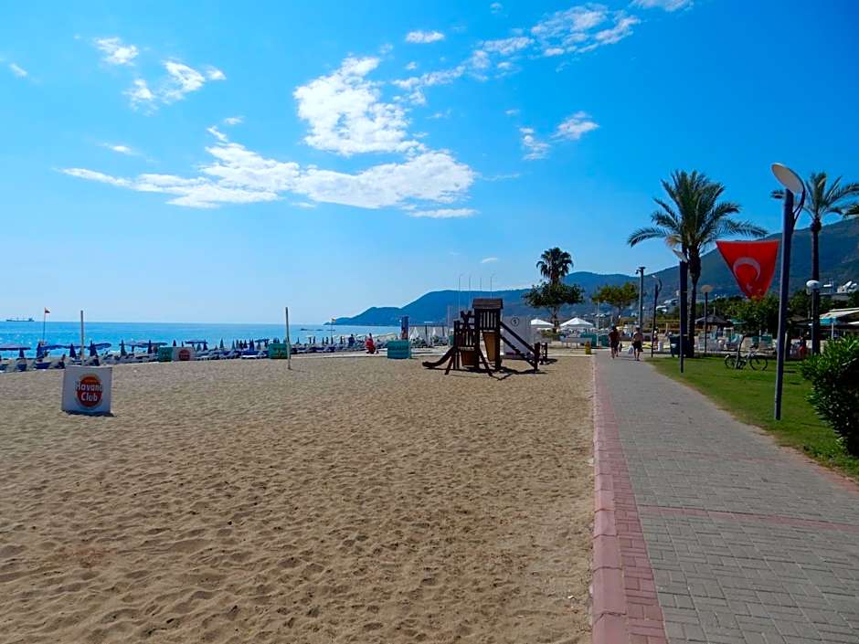 Rooms feature extra-long beds (> 6.5 ft) and baths, and many offer garden views from private balconies, adding a touch of calm to the lively beach scene. The property's seaside setting, proximity to the city center, and location in the Kleopatra area make it a practical base for exploring Alanya’s coastline.